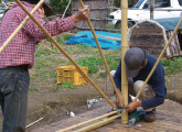 この『竹テント』の特徴は、指導者のもとであれば、はじめての方でも比較的容易に組み立てられ、従来の『鉄製テント』に比べて非常に軽量であり、組み立てによる事故(指挟み、腰への負担など)の可能性もほとんどないのが特徴です。